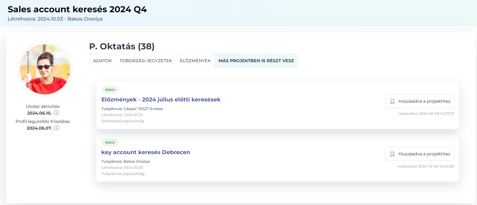 „Egy másik szembetűnő változás, hogy teljesen megújult a jelöltek profiloldala. Természetesen megmaradt az adatlap, ahol az alapadatokon túl megnézhetik a felhasználók a potenciális jelölt tapasztalati szintjét, képességeit, igényeit, elvárásait. Ezen túl most már a profiloldalon toborzási jegyzeteket is hozzáadhatunk, ami onnantól kezdve látható lesz minden, velünk egy csapatban dolgozó kolléga számára. Lehet látni az adott profil előzményeit, megtekintette-e más a jelöltet, esetleg szerepel-e valaki más projektjében a cégen belül.”