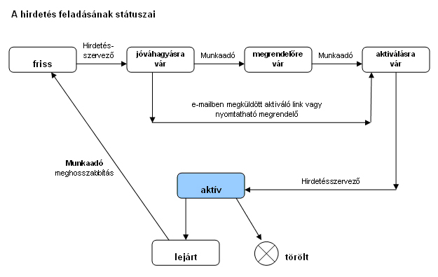 A meghirdetett pozícióra, illetve a megfelelő ikonokra kattintva megtekintheti, törölheti, módosíthatja és meghosszabbíthatja hirdetését.Az oldal tetején található megfelelő fülekre kattintva áttekintheti az összes eddig feladott hirdetését, illetve hogy hirdetései milyen fázisban vannak.
