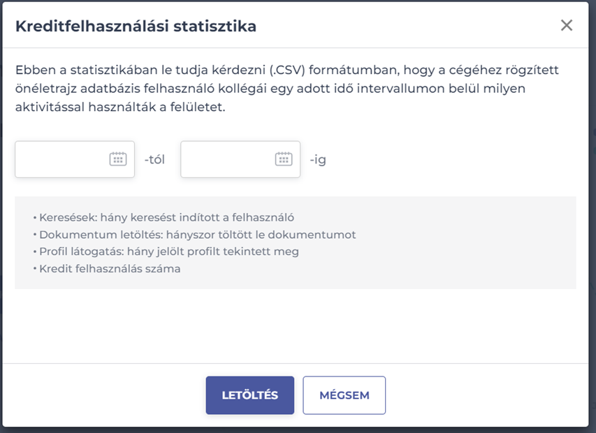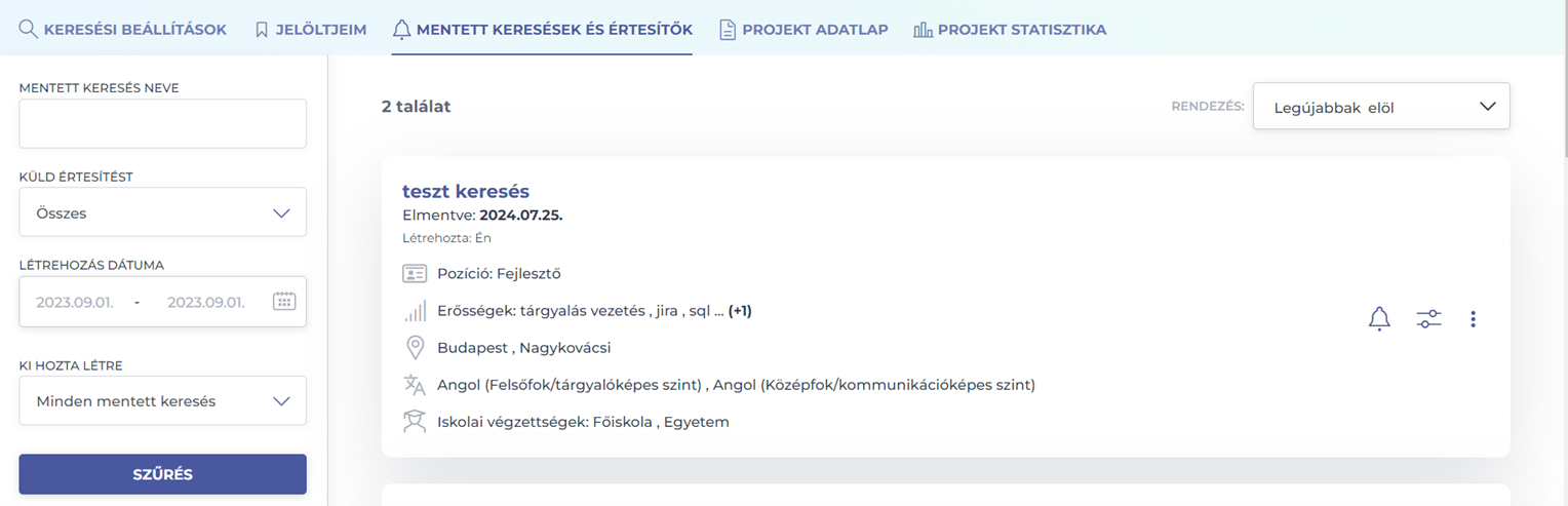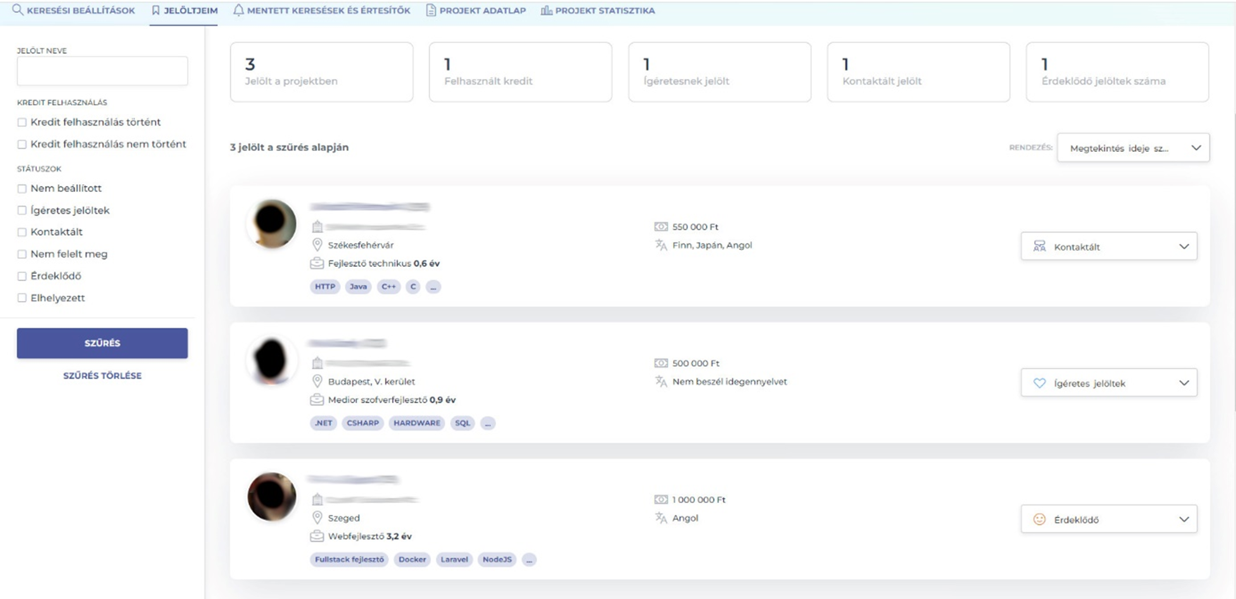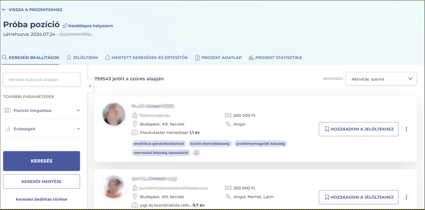 Az adatbázisban csak azokat a munkavállalókat listázzuk ki a munkáltatók számára, akik proaktívan hozzájárultak ahhoz, hogy a profiljuk elérhető legyen, és az elmúlt két évben valamilyen formában álláskeresési aktivitást mutattak. Álláskeresési aktivitásnak számít, ha az álláskereső: