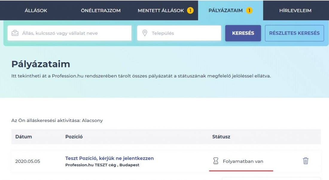 Ez a státuszállítás a munkavállaló számára eddig csak a profiljában volt követhető, a Pályázataim menüpontban.