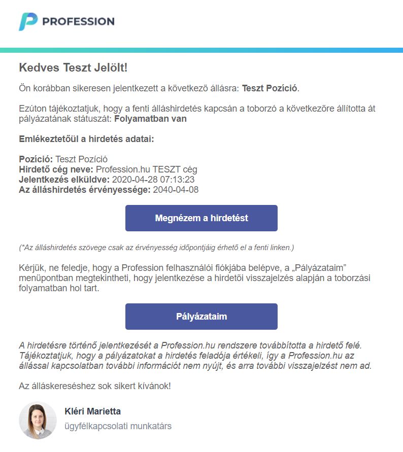 Mostantól azonban emailben is értesülni fognak a jelöltek akkor, ha Ön módosítja a pályázatuk státuszát. A levél a következőképpen néz ki: