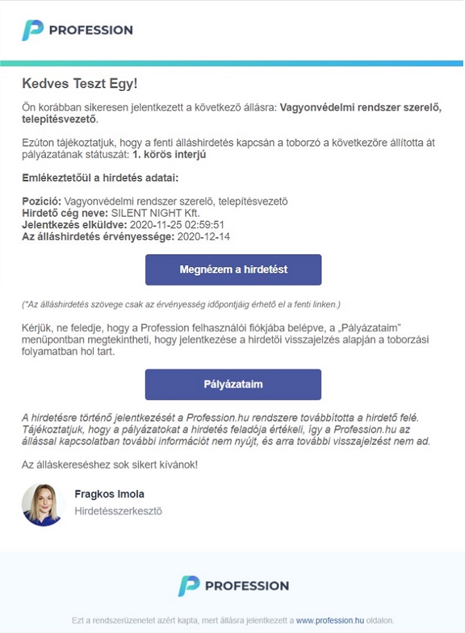 Amennyiben a saját státusza esetében azt választja, hogy a jelölt értesüljön a státuszváltásról, úgy a munkavállaló ezt az automatikus levelet fogja megkapni. Ennek a levélnek a szövege a Profession rendszerre által automatizált, tartalma tehát nem szerkeszthető.