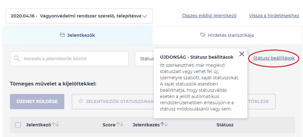 Amennyiben töröl egy saját státuszt, viszont az a státusz valamely jelölt számára jelenleg is be van állítva, akkor bár a státusz törlésre kerül, és a továbbiakban más jelöltek számára nem fogja tudni beállítani ezt a státuszt, annál a jelöltnél, ahol ez az utoljára beállított státusz, ott továbbra is látni fogja a státusz nevét egy „(törölt)” feliratú jelzéssel.