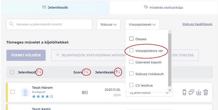 A visszajelzésre váró, vagy már visszajelzést kapott jelöltekre lehetősége van külön szűrni is, illetve a kis nyilak segítségével rendezheti a jelölteket a pályázat leadásának időbeli sorrendje (ez az alapbeállítás), a score (pontszám) vagy a nevük ABC sorrendje szerint is.