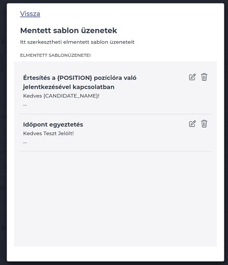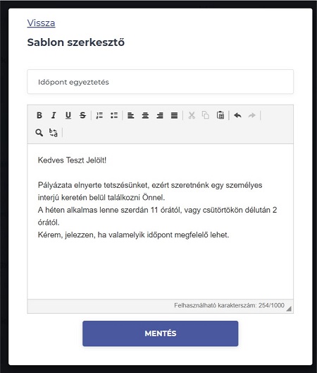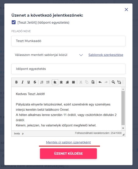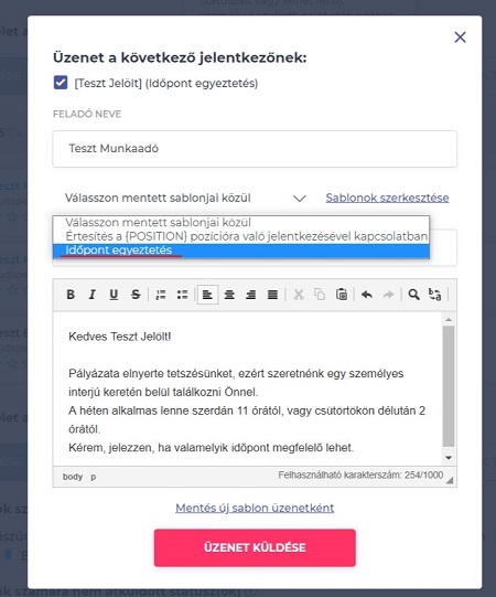 Mostantól, amikor üzenetet szeretne küldeni a jelölteknek, akkor az üzenetküldő ablakban lehetősége van elmenteni az üzenetét sablonként, illetve a már elmentett sablonok közül is választhat ahelyett, hogy újra be kellene gépelnie a levelét.