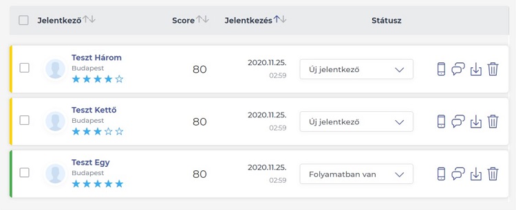 Az új fejlesztéseknek köszönhetően most már azt is könnyen láthatja, hogy melyek azok a jelöltek, akiknek még nem küldött semmilyen visszajelzést. Fontos: visszajelzésnek számít a munkaadó által kiküldött üzenet (akár sablonból, akár nem), illetve minden olyan státusz beállítása, amely automatikus rendszerüzenetet küld a jelöltnek. Azok a jelöltek, akik még nem kaptak semmilyen visszajelzést a pályázatukra, sárga szélű kártyán jelennek meg, illetve a teljes profiljukon is jelezzük, hogy a jelölt „Visszajelzésre vár”. Amint megtörtént a visszajelzés (üzenetküldés vagy státuszállítás formájában), úgy a jelölt-kártya színe átvált zöldre.